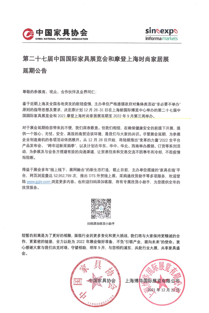 鑒于近期上海及全國各地突發(fā)的新冠疫情,主辦單位嚴格遵循政府對集體類活動“非必要不舉辦”原則的指導(dǎo)思想及要求,決定原計劃12月28-31日在上海新國際博覽中心舉辦的第二十七屆中國國際家具展覽會和2021摩登上海時尚家居展延期至 2022年9月第三周 舉辦。