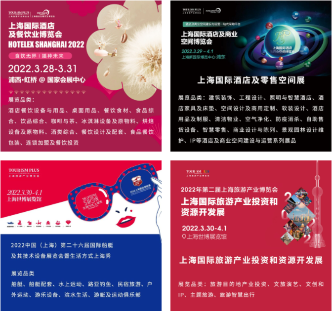 上海旅游產(chǎn)業(yè)創(chuàng)新峰會、旅游產(chǎn)業(yè)投資大會、中國文旅大消費年度峰會、中國文旅演藝高峰論壇、中國酒店采購高峰論壇、中國購物中心發(fā)展高峰論壇、中國商業(yè)特許經(jīng)營春季峰會、中外設(shè)計師高峰論壇、中外照明設(shè)計師高峰論壇、中國餐飲產(chǎn)業(yè)生態(tài)峰會、上海國際物業(yè)高峰論壇、智慧商廚高峰論壇、星廚美食高峰論壇、2022 中國新烘焙影響力峰會