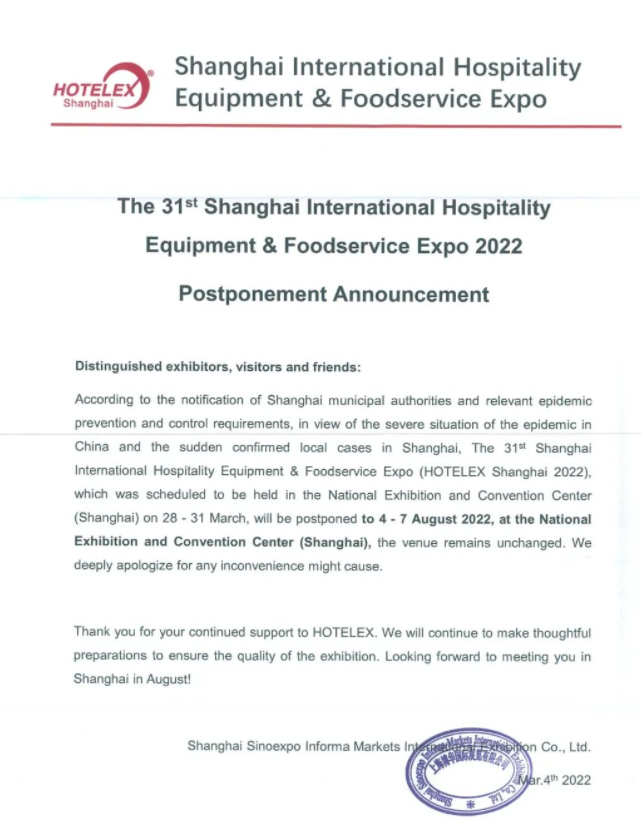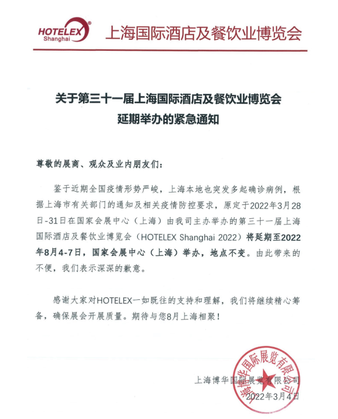 2022 HOTELEX上海國際酒店及餐飲業(yè)博覽會延期通告