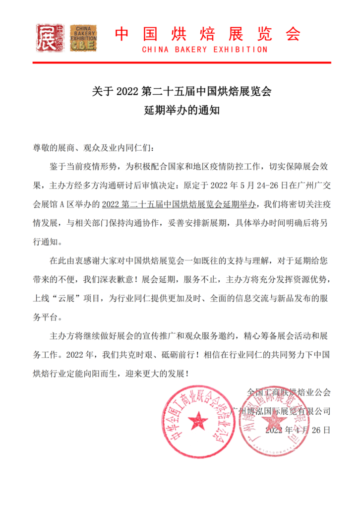 鑒于當(dāng)前疫情形勢,為積極配合國家和地區(qū)疫情防控工作,切實保障廣大參展商、專業(yè)觀眾及合作伙伴的健康安全和展會效果,主辦方經(jīng)多方溝通研討后審慎決定:原定于2022年5月24-26日在廣州廣交會展館A區(qū)舉辦的2022第二十五屆中國烘焙展覽會延期舉辦。