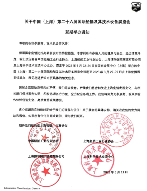 原定于2022年6月22-24日在國家會展中心(上海)舉辦的中國(上海)第二十六屆國際船艇及其技術(shù)設(shè)備展覽會和生活方式上海秀將延期至2023年3月27-29日在上海世博展覽館舉辦,