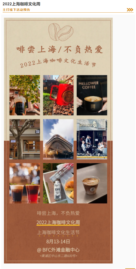 2022上??Х任幕罟?jié)將作為咖啡文化周的主打線下活動(dòng)將于8月13、14日在BFC外灘金融中心舉辦。上??Х任幕罟?jié)將融合“咖啡+展演”“咖啡+電競(jìng)”“咖啡+文創(chuàng)”等各類跨界文化元素。