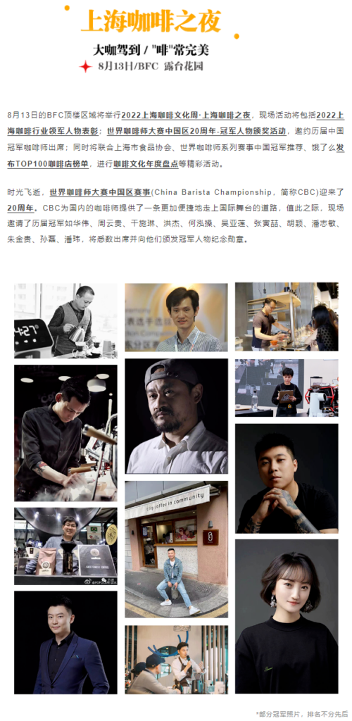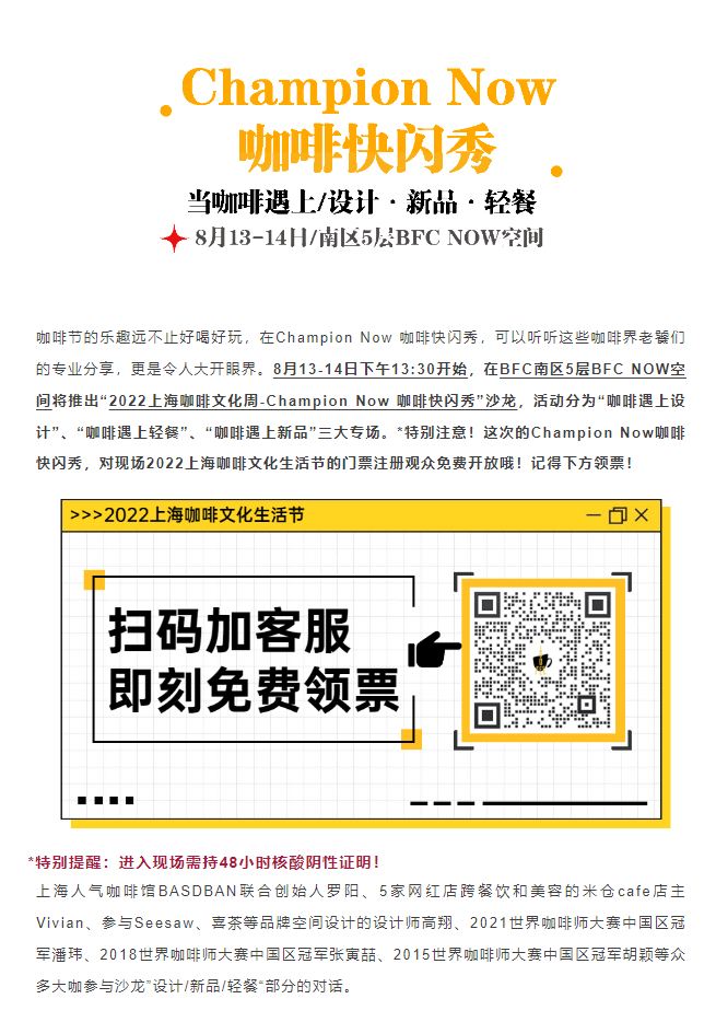 由上海市委宣傳部、市商務(wù)委、市文旅局共同牽頭,上海博華國(guó)際展覽有限公司作為承辦方之一的2022年第二屆上??Х任幕芤延?月4日正式開幕啦!2022上??Х任幕苤鞔蚓€下活動(dòng)即將于8月13-14日,在BFC外灘金融中心(黃浦區(qū)中山東二路600號(hào))現(xiàn)場(chǎng)舉辦!現(xiàn)場(chǎng)將舉辦集咖啡文化生活節(jié)、咖啡新品發(fā)布會(huì)、咖啡沙龍分享會(huì)、咖啡之夜晚會(huì)等活動(dòng)為一體的綜合性盛會(huì)!趁著放假,還不領(lǐng)上門票去逛逛!