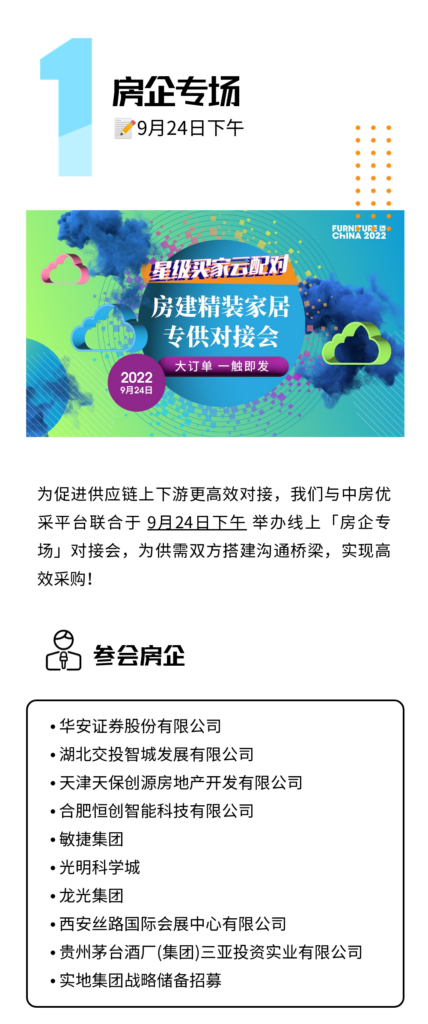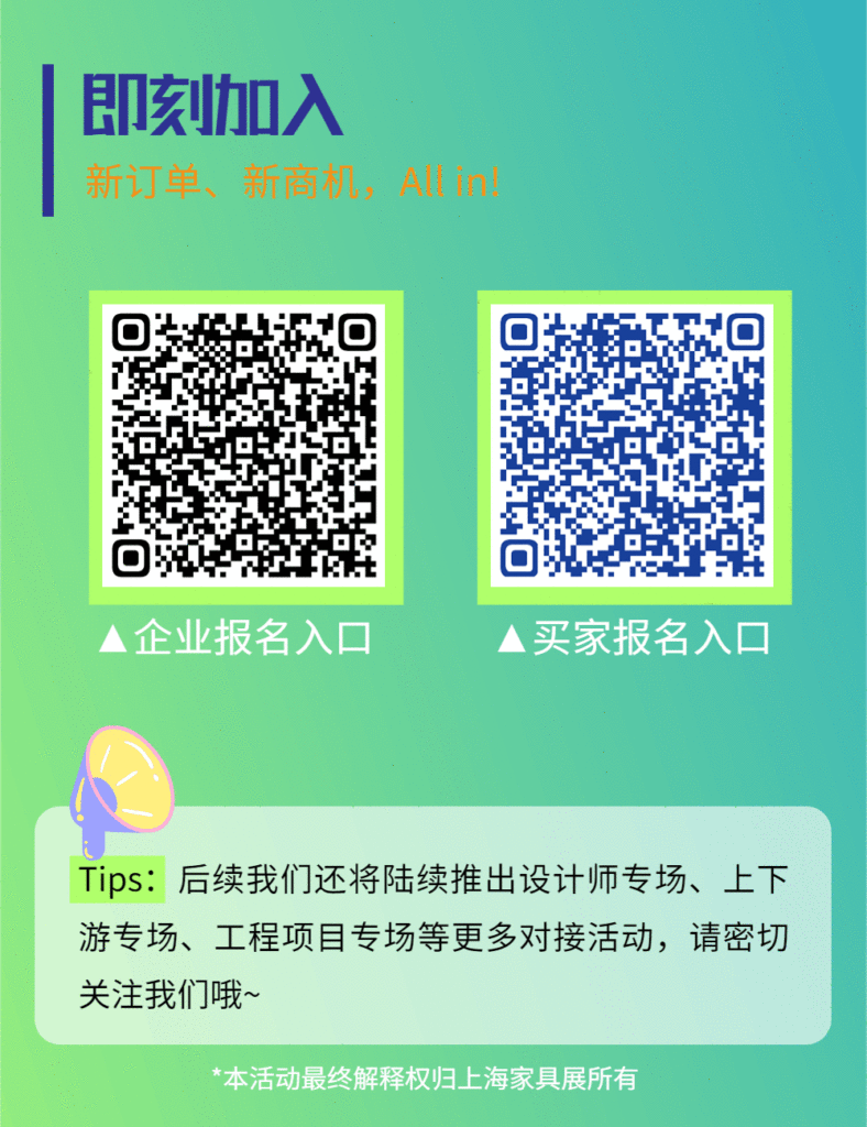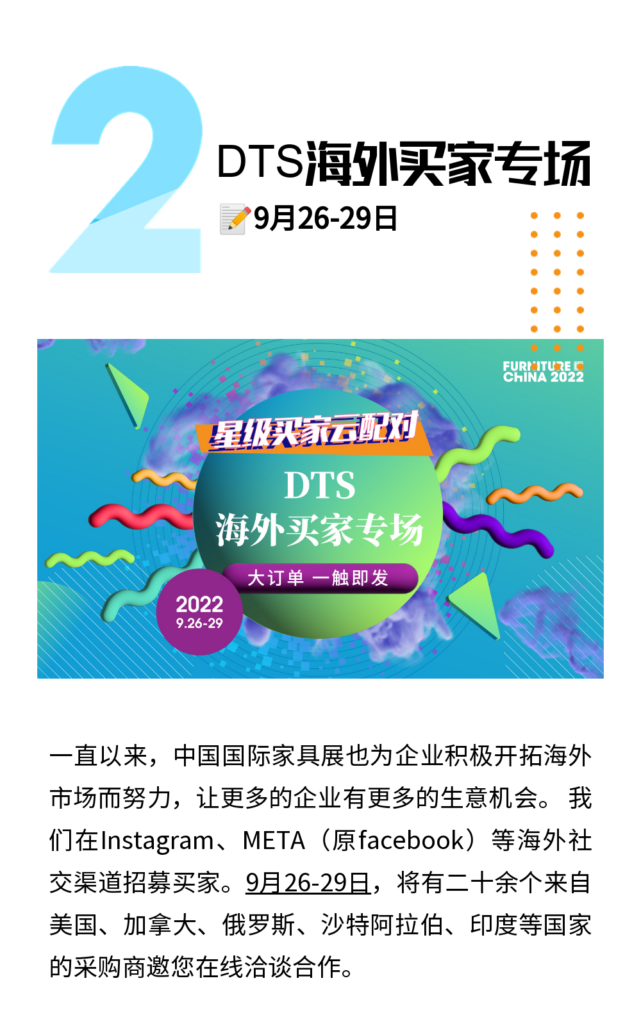 中國國際家具展以推動供應鏈上下游精準對接為目的,為企業(yè)和買家搭建專屬高效的洽談合作平臺,促進供需雙方聚合聯(lián)動,實現(xiàn)抱團發(fā)展,攜手共贏。9月24-30日,房企專場,DTS海外買家專場就要來啦!活動將采取線上1V1建群和視頻連線方式,企業(yè)和買家可“屏對屏”高效獲取線索和匹配合作意向。