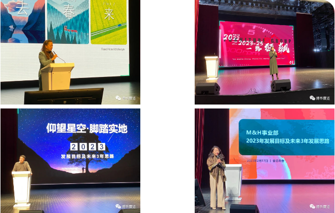 下午的環(huán)節(jié),由各大事業(yè)部負(fù)責(zé)人及部門(mén)代表圍繞大會(huì)內(nèi)容進(jìn)行主題分享,食品酒店和生活方式(FHL)事業(yè)部帶來(lái)的 “冬去春來(lái)”,家具(Furniture)事業(yè)部的 “2022年再也不見(jiàn),2023-2025年一路狂飆”,酒店商業(yè)空間(HSP)事業(yè)部的”仰望星空,腳踏實(shí)地”,以及制造及健康(M&H)事業(yè)部的2023年的發(fā)展目標(biāo)和未來(lái)3年發(fā)展思路,先后介紹了各事業(yè)部的營(yíng)收目標(biāo)和實(shí)現(xiàn)路徑,對(duì)區(qū)域發(fā)展的思考,以及在云展電商,團(tuán)隊(duì)架構(gòu),人才管理, 內(nèi)容變現(xiàn)等方面所制訂的發(fā)展規(guī)劃和創(chuàng)新之舉,讓全體員工對(duì)各事業(yè)部的未來(lái)發(fā)展和如何實(shí)現(xiàn)目標(biāo)有了清晰直觀的了解和認(rèn)識(shí)。