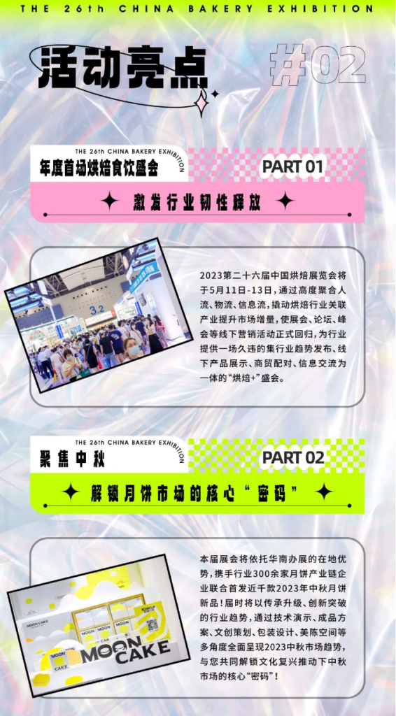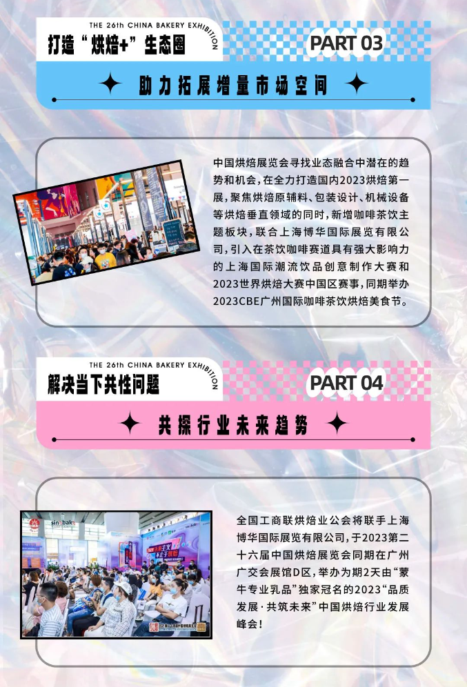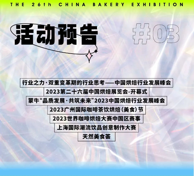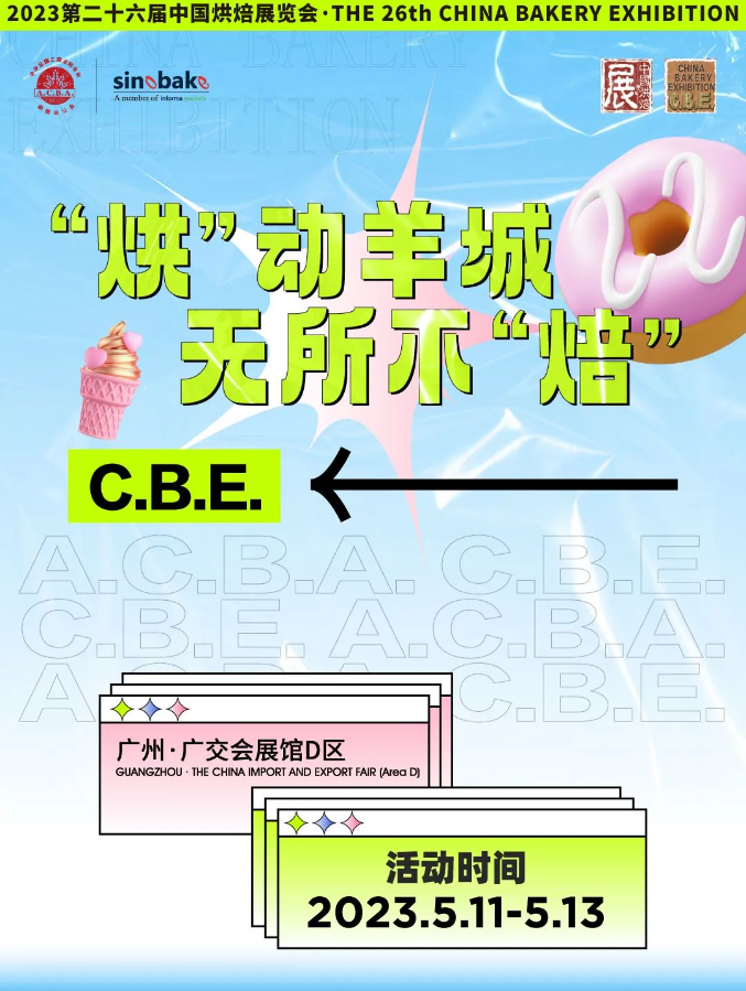 “烘”動(dòng)羊城·無(wú)所不“焙” 5月11-13日廣州·廣交會(huì)展館D區(qū), 2023第二十六屆中國(guó)烘焙展覽會(huì), 100000㎡展示面積, 1000+優(yōu)質(zhì)展商, 200000+專(zhuān)業(yè)觀眾, 10余場(chǎng)主題活動(dòng)以產(chǎn)品展示、峰會(huì)論壇、專(zhuān)業(yè)比賽等多種方式全方位呈現(xiàn)一場(chǎng)”烘焙+”盛會(huì)!