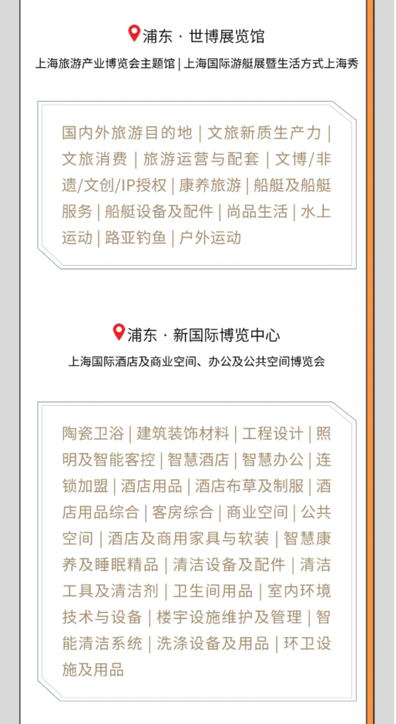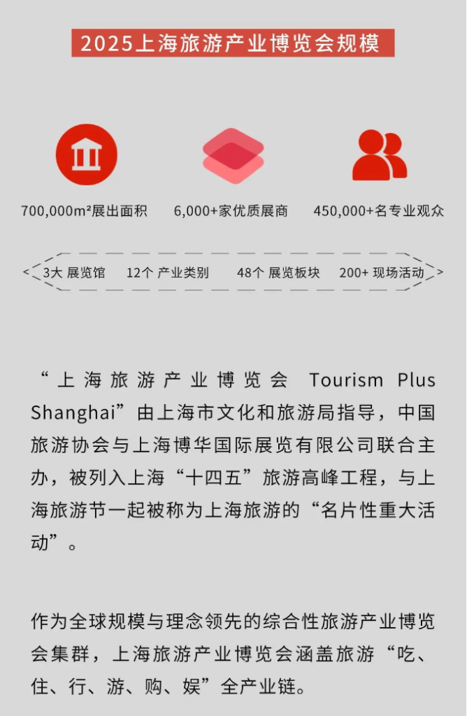 2025年3月30日至4月3日,2025上海旅游產(chǎn)業(yè)博覽會將在上海展覽面積前3大的展覽場館中以四大集群展同期開展的形式,70萬平方米的總展覽規(guī)模,以及覆蓋“吃、住、行、游、購、娛”全產(chǎn)業(yè)鏈,包含12個產(chǎn)業(yè)大類的48個展覽板塊的展覽范圍,和超過200項現(xiàn)場活動,預計將吸引6000余家優(yōu)質(zhì)展商和超過45萬觀眾。
