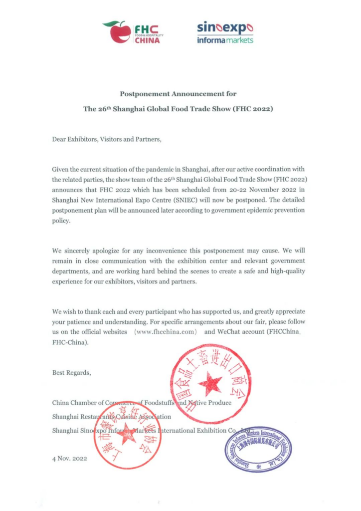 Given the current situation of the pandemic in China, after our active coordination with the related parties, the show team of the 26th Shanghai Global Food Trade Show (FHC 2022) announces that FHC 2022 which has been scheduled from 20-22 November 2022 in Shanghai New International Expo Centre (SNIEC) will now be postponed. The detailed postponement plan will be announced later.