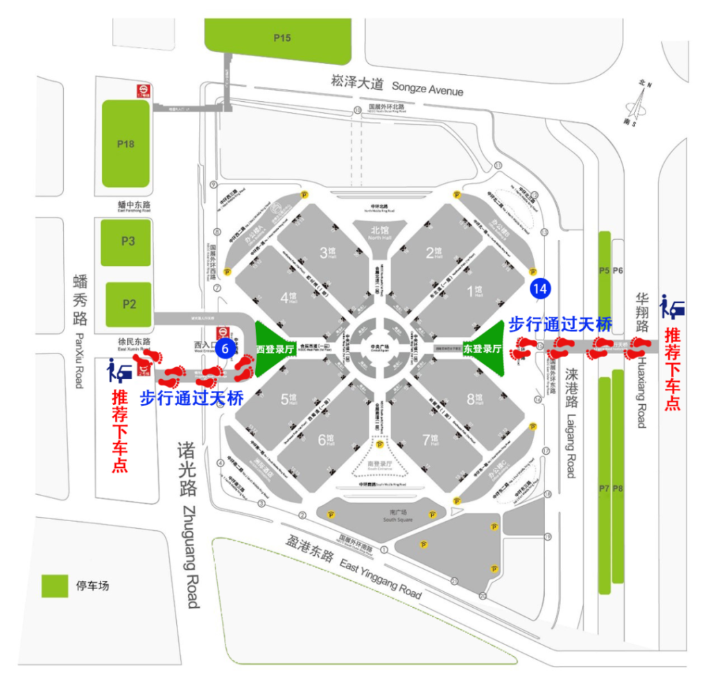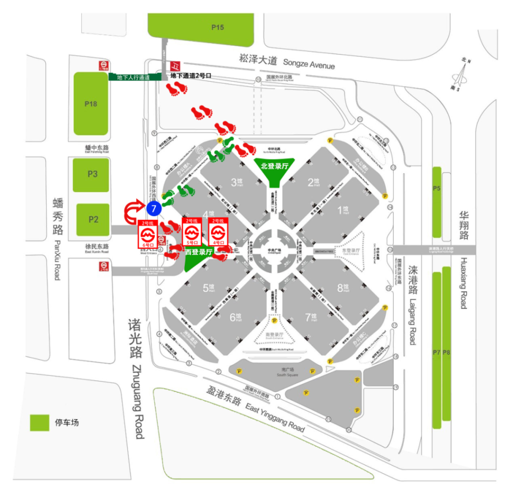 - National Exhibition and Convention Center Station, Exit 6, turn right into the hall at Gate 7 and arrive directly at the exhibition hall, via the escalator to the West 8-meter level (2nd Floor NECC Footpath) Entrance;